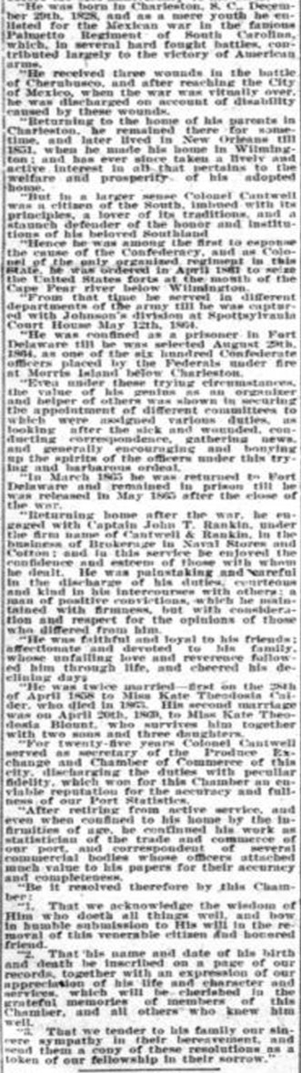 Col. Cantwell was born in Charleston, S. C, and would have been eighty-one years of age on the 29th of this month. He joined the famous Palmetto regiment of South Carolina and valiantly fought the battles of his country when a mere youth during the Mexican War. Returning to the East, after the close of this conflict, he located in New Orleans for a few years and served as a drug clerk there through three yellow fever epidemics, coming to Wilmington in 1851 and engaging in business, which was soon interrupted by another call to arms in the bloody conflict between the states from 1861-5. On the 28th of April, 1858, Col. Cantwell married Miss Kate Theodosia Calder, a sister of Mr. William Calder, of this city, of this union there are now surviving an only son, Mr. Robert C. Cantwell. She passed away in 1863, and after the war, on April 20, 1869, Col. Cantwell married a second time, Miss Kate Theodosia Blou[n]t, of Woodville, Miss., and she with three daughters and one son now survive, having the tenderest sympathy of a host of friends here and elsewhere in the great sorrow that has come to them.