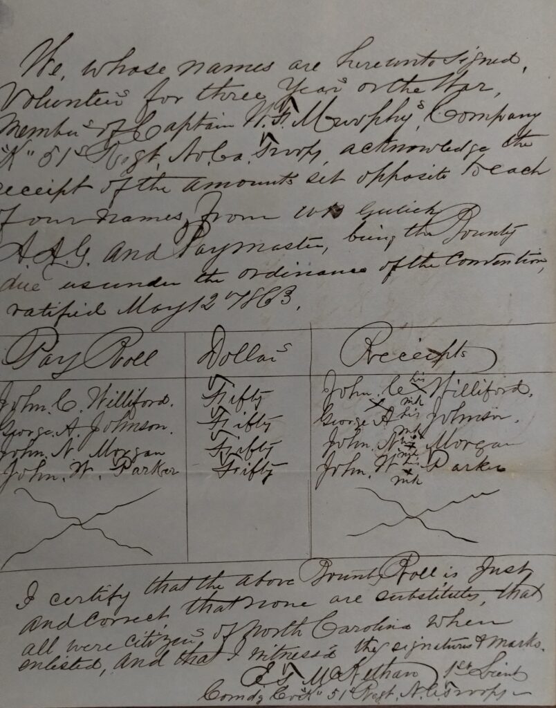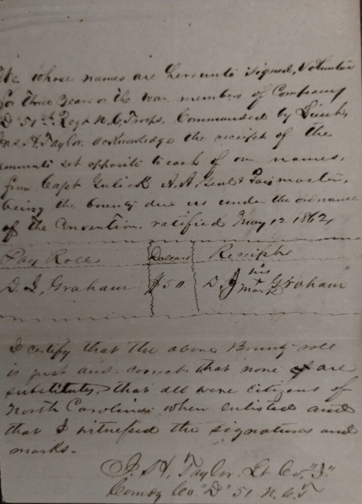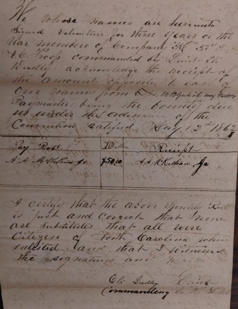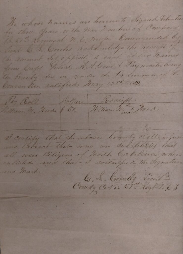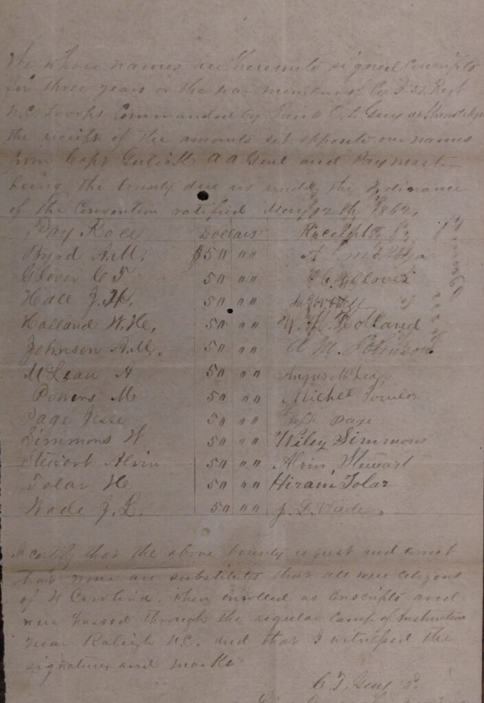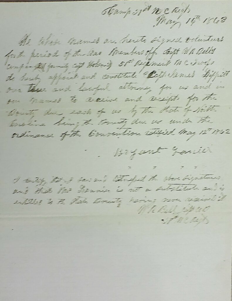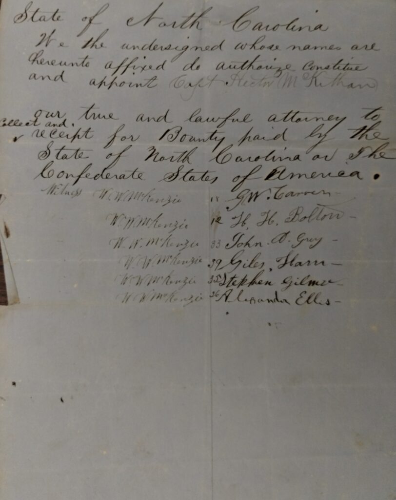 In February 1862, North Carolina authorized a $50 bounty for new recruits enlisting for three years or the war. When the men received their bounties, they were required to sign a “bounty payroll,” acknowledging receipt of the money. Sometimes, the men created a power of attorney (POA) for their commanding officer to receive their bounties for them.