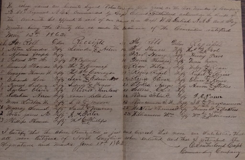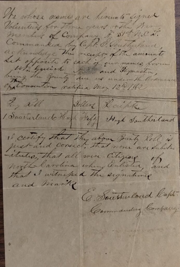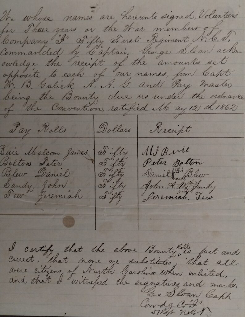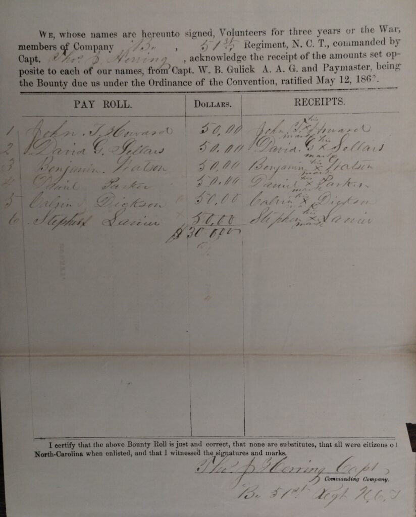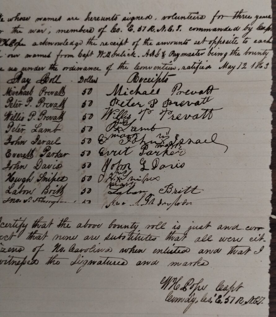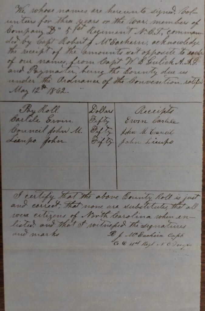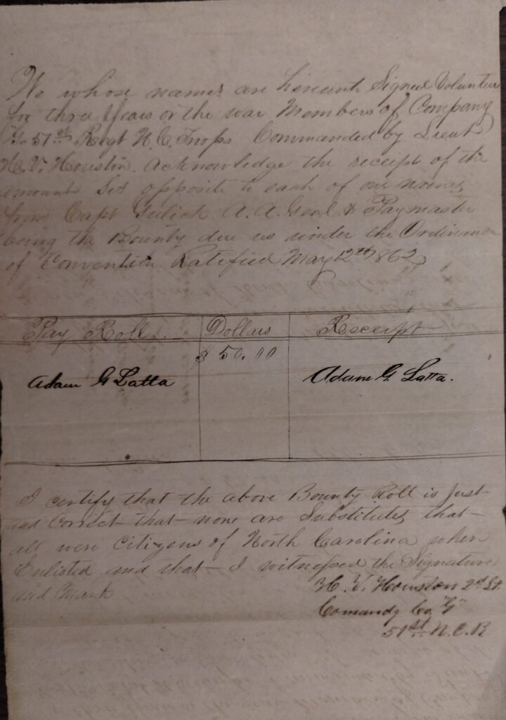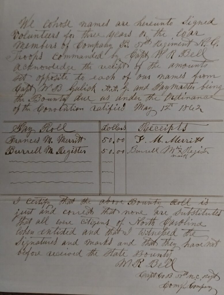 In February 1862, North Carolina authorized a $50 bounty for new recruits enlisting for three years or the war. When the men received their bounties, they were required to sign a “bounty payroll,” acknowledging receipt of the money. Sometimes, the men created a power of attorney (POA) for their commanding officer to receive their bounties for them.