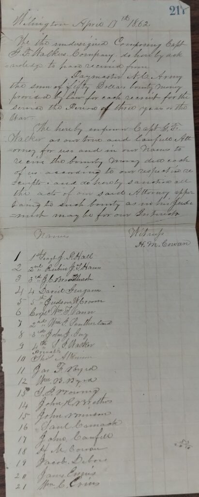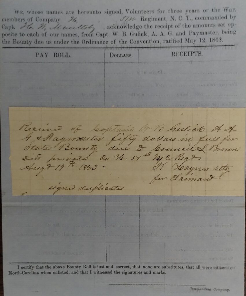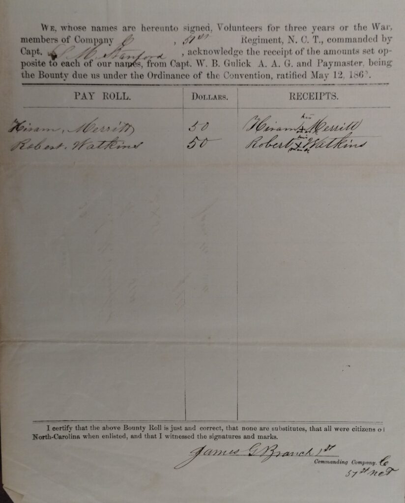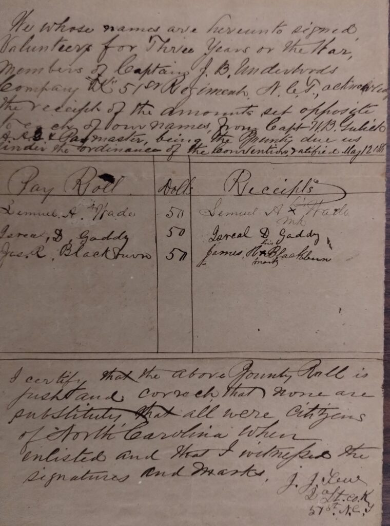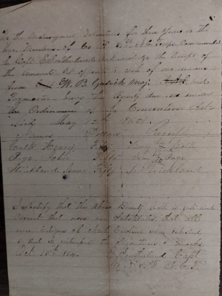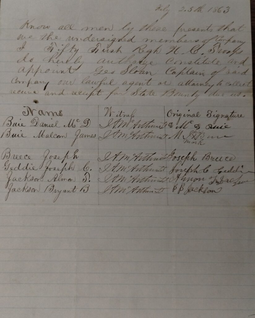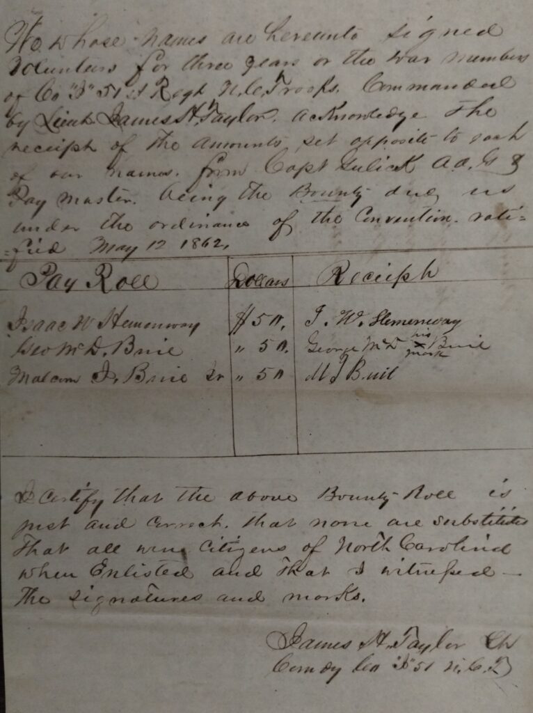 In February 1862, North Carolina authorized a $50 bounty for new recruits enlisting for three years or the war. When the men received their bounties, they were required to sign a “bounty payroll,” acknowledging receipt of the money. Sometimes, the men created a power of attorney (POA) for their commanding officer to receive their bounties for them.