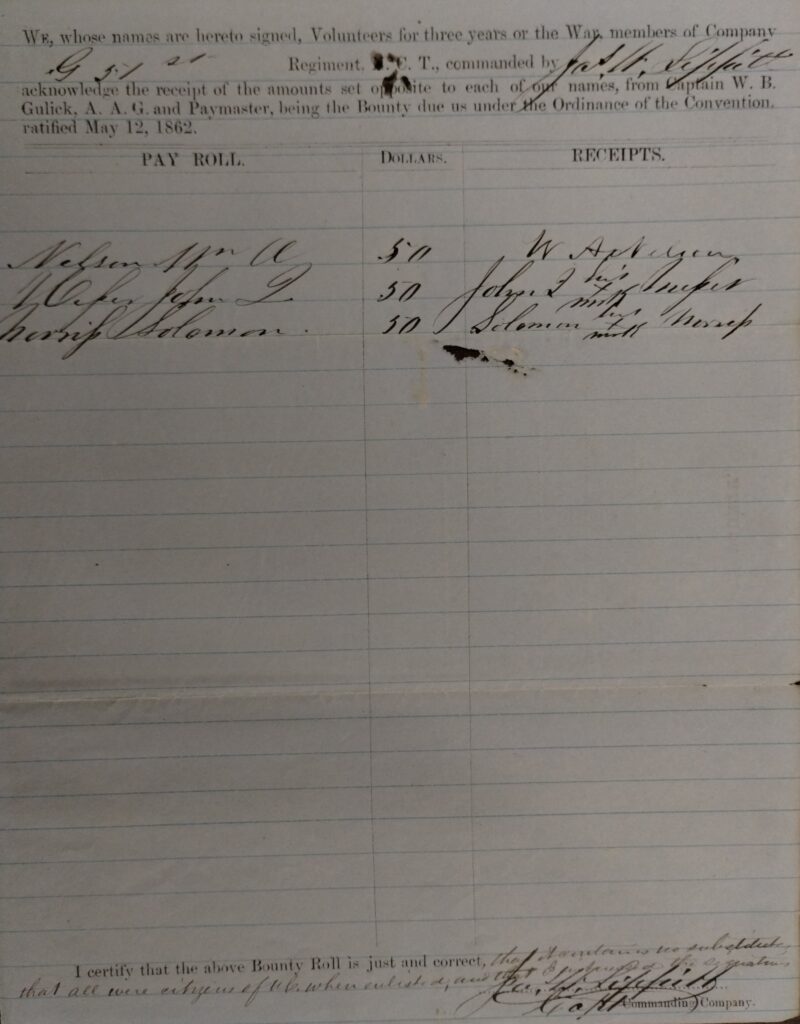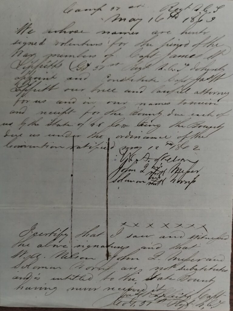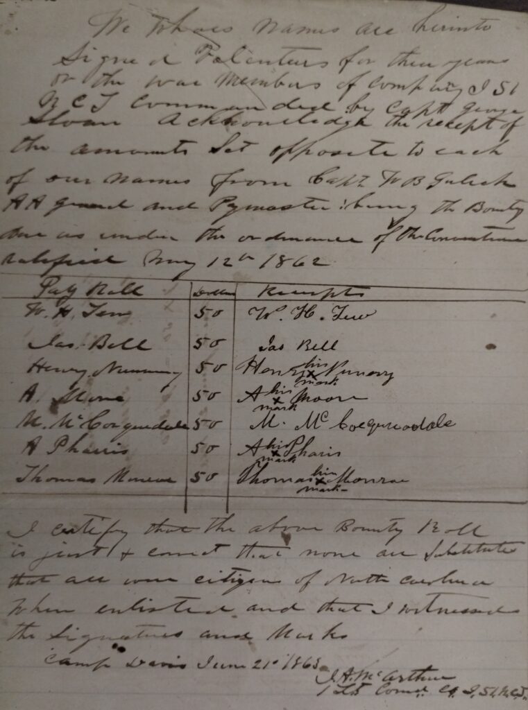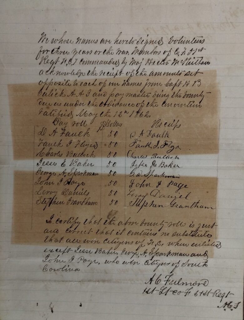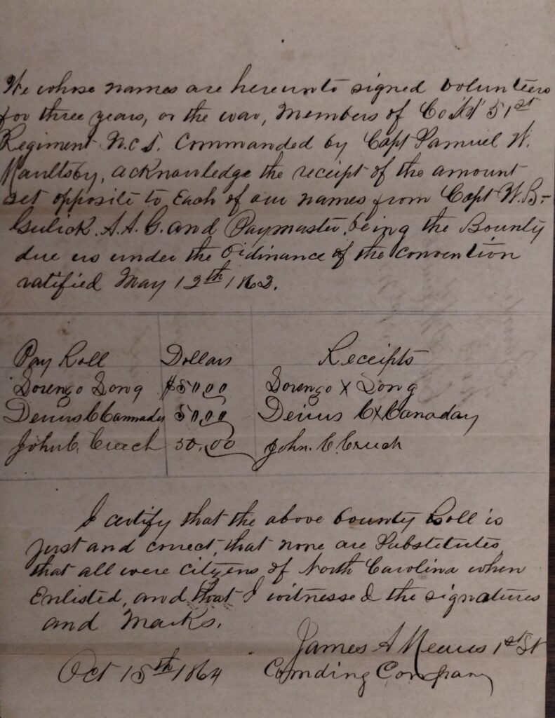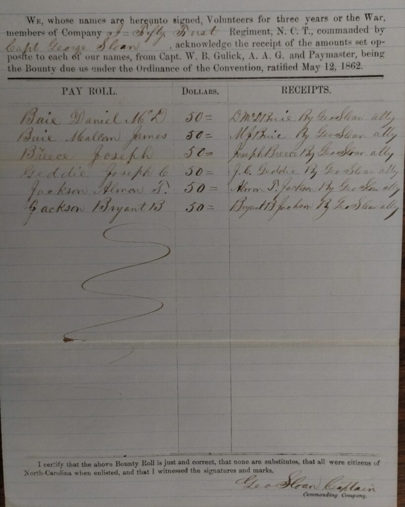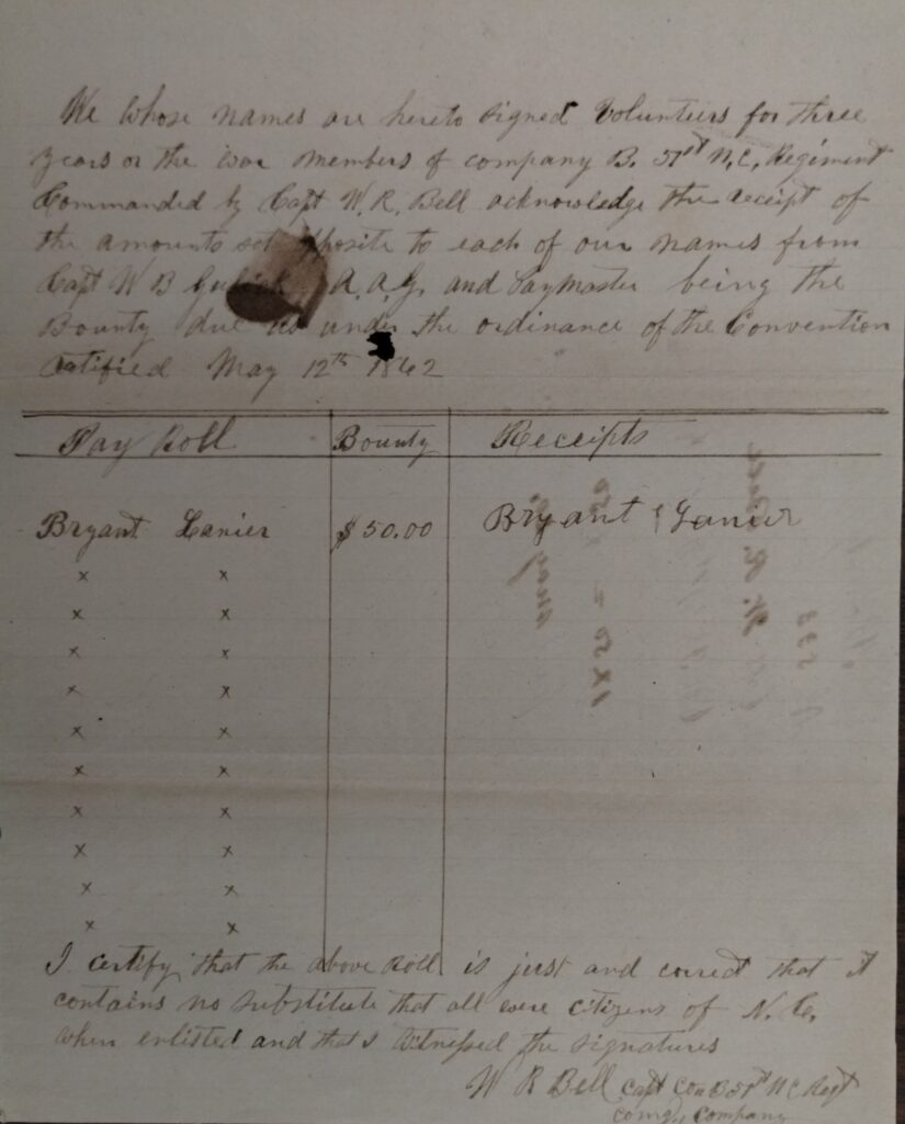 In February 1862, North Carolina authorized a $50 bounty for new recruits enlisting for three years or the war. When the men received their bounties, they were required to sign a “bounty payroll,” acknowledging receipt of the money. Sometimes, the men created a power of attorney (POA) for their commanding officer to receive their bounties for them.