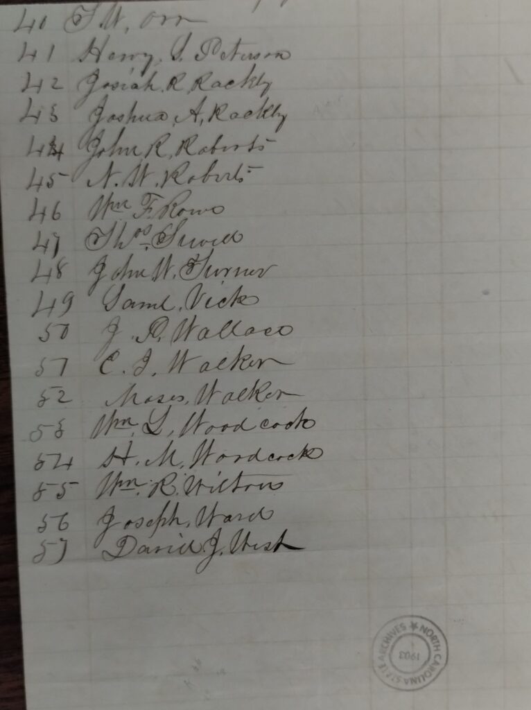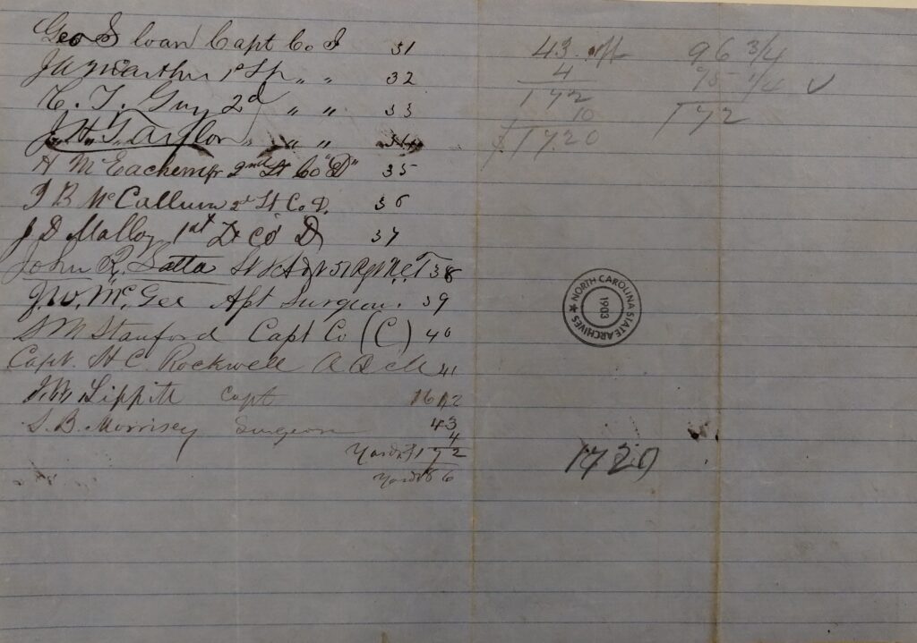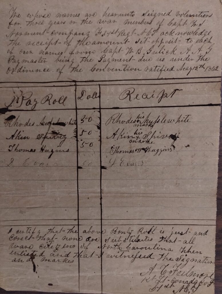 Some of the original bounty payrolls are preserved at the North Carolina State Archives, Original Civil War Collection, Box 15. All images were taken by Kirk Ward, who apologizes for the quality.