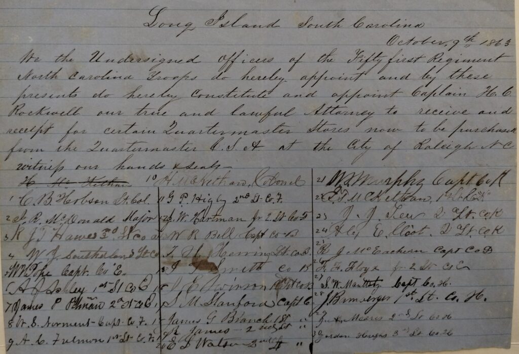 POA signed by 43 officers giving authority to Captain Henry Rockwell, the regiment’s AQM, to purchase “certain Quartermaster Stores”