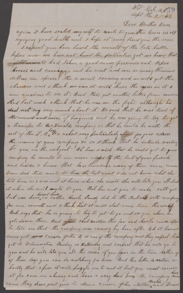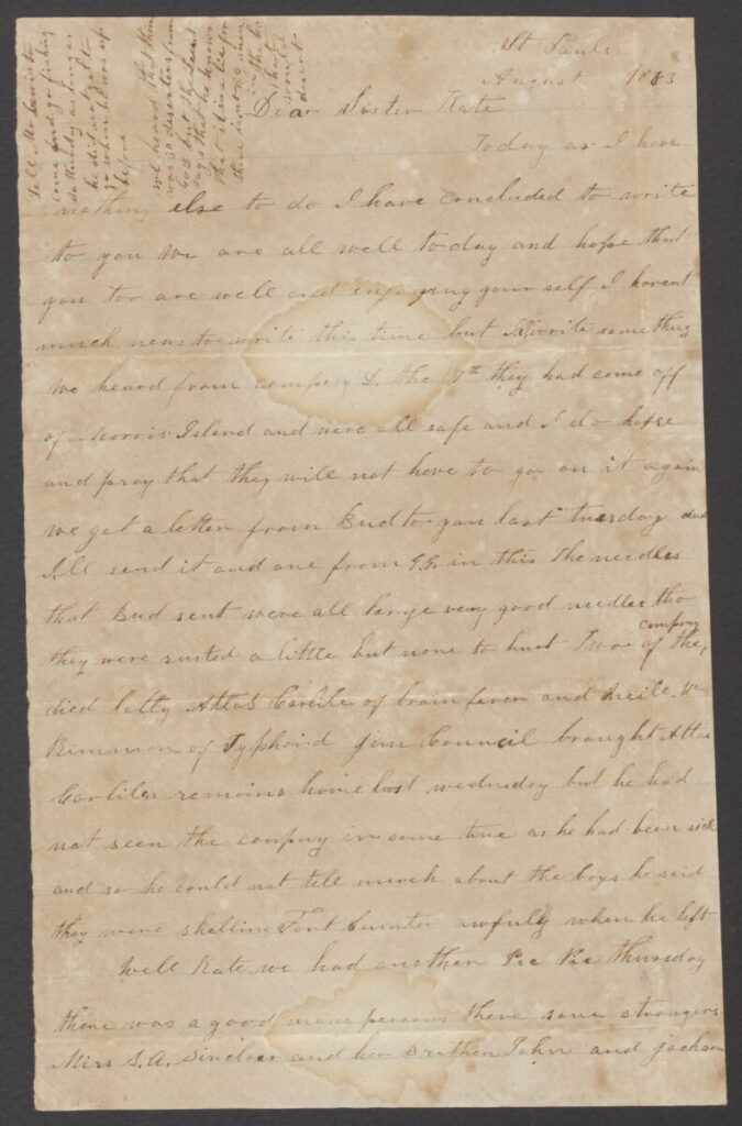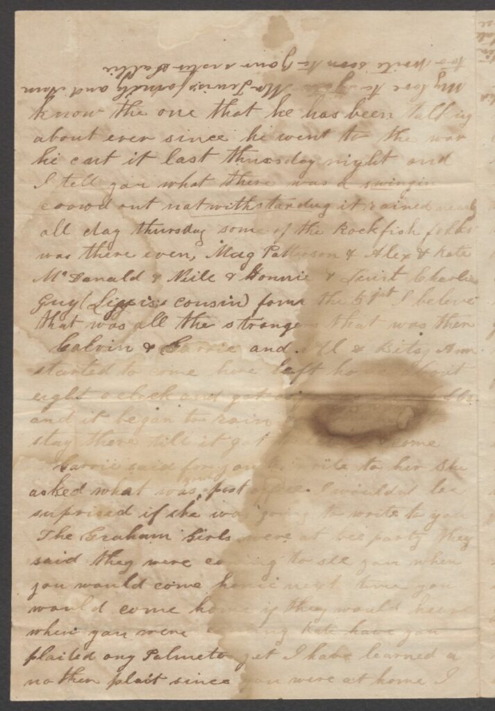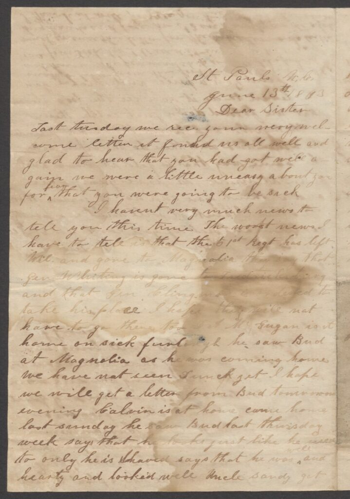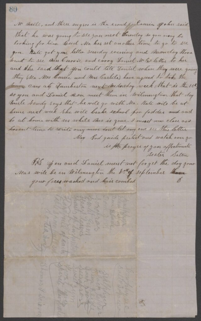 Sara “Sallie” McGeachy (1839-1915) resided in St. Pauls, NC during the war. She was an older sister of Private John D. McGeachy, who served in Company D of the 51st North Carolina. One of the letters below was written to John. The other two letters were sent to Sallie’s oldest sister, Kate.