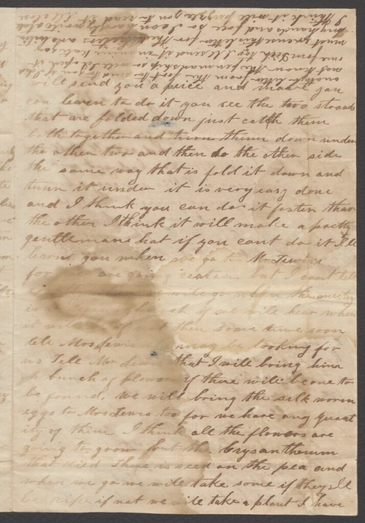 Written sideways at the bottom of the first letter is what appears to be a recipe for a tonic: sulphur, black pepper, deer blade, dock root, sassafras, sweet gum, heart leaves, spirits of turpentine. Handfull of each, tablespoon full of sul[phur].