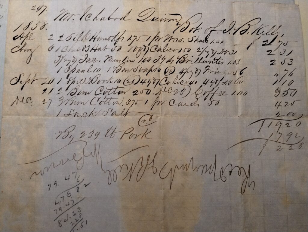 Quinn ran up a tab of $19.20 with J. B. Kelly during 1858. He paid off most of the debt with 239 pounds of pork at 7.5 cents per pound.