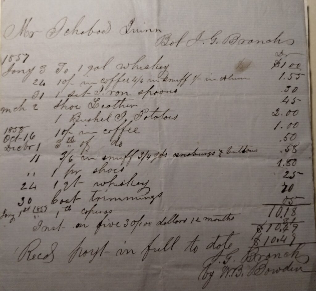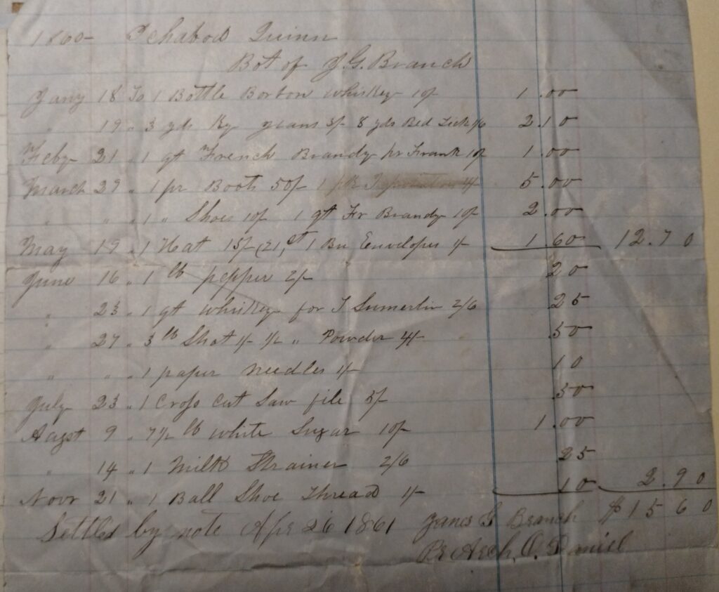 In 1857 and 1860, Quinn bought his supplies from James G. Branch. Branch was a successful farmer and merchant in Duplin County, and in 1860, he was elected to the General Assembly. He was appointed 1st Lieutenant of Quinn’s company (Company C). One of Branch’s clerks, William B. Bowden, served as a sergeant in the same company.