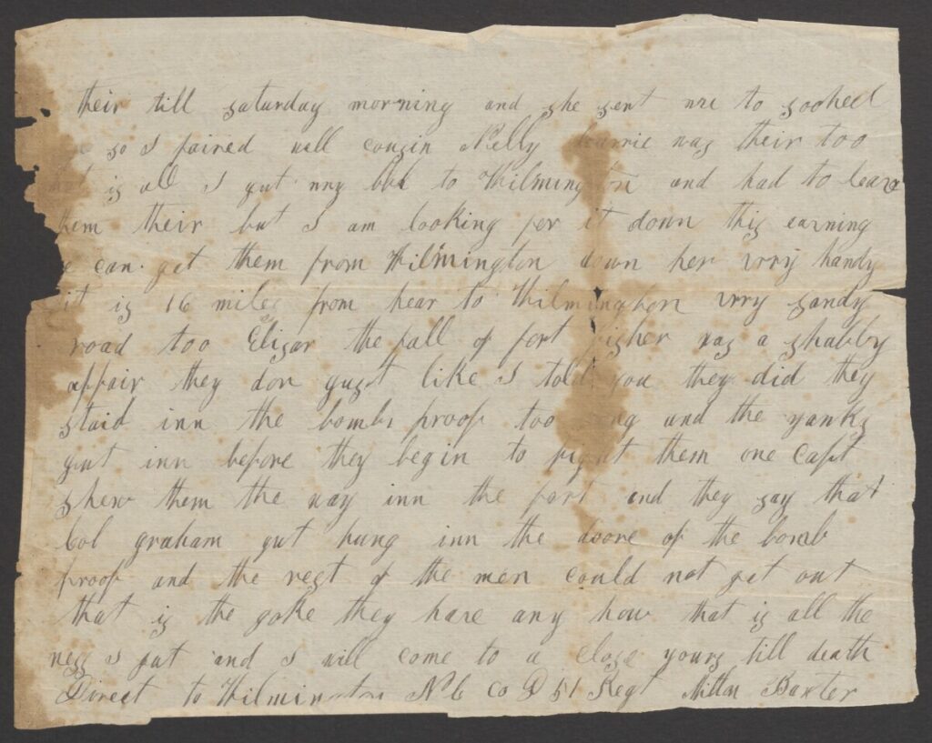 Milton Baxter served as a private in Company D, 51st North Carolina from Dec 1863 until the end of the war. He wrote the letter below immediately after returning from his first ever furlough.